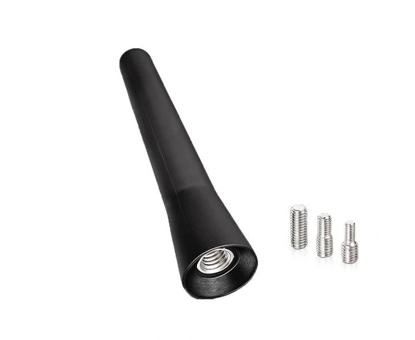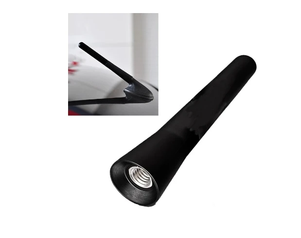 Antennin pituus vain 6,5cm. Sisältää adapterit M4, M5 ja M6 -kierteille. Materiaali kumi/muovi, hiukan joustava, väri musta. Tarkoitettu vaihdettavaksi auton alkuperäiseen antennijalkaan.