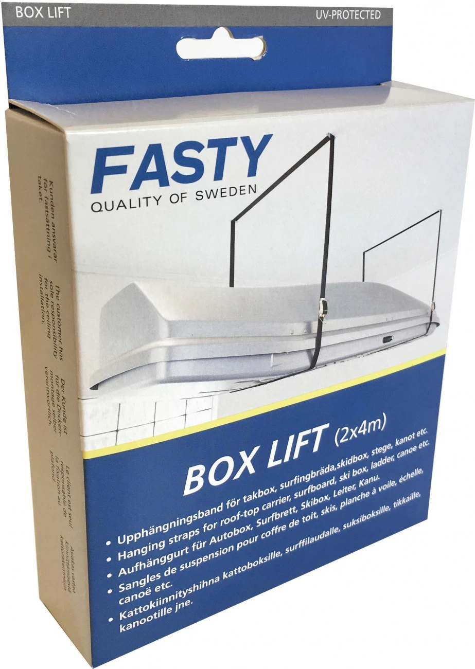 Fasty Boxlift on helppo ja yksinkertainen apu pitkien tavaroiden säilyttämiseen. Pakkauksessa on kaksi liinaa, joiden pituus on 4 metriä. Väri musta. Sisältää 2kpl hihnat, 4kpl kiinnitysraudat ja 8kpl kiinnitysruuvit 4x40mm.Fasty Boxlift auttaa säilyttämään esimerkiksi suksiboksit, SUP-laudat, surffilaudat, kajakit, kanootit ym. pitkät esineet turvallisesti katossa, jolloin ne eivät vie lattiatilaa, eivätkä ole alttiina vahingoille.