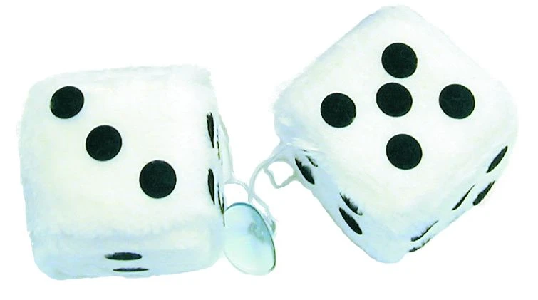 Perinteinen karvanoppapari taustapeiliin, takasivulasiin jne. Arpakuution koko 7x7cm. Kaksi arpakuutiota, jotka on yhdistetty narulla, imukuppikiinnitys.
