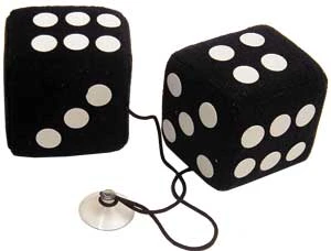 Perinteinen karvanoppapari taustapeiliin, takasivulasiin jne. Arpakuution koko 7x7cm. Kaksi arpakuutiota, jotka on yhdistetty narulla, imukuppikiinnitys. Värit: musta/valkoinen, pinkki/musta, valkoinen/musta.