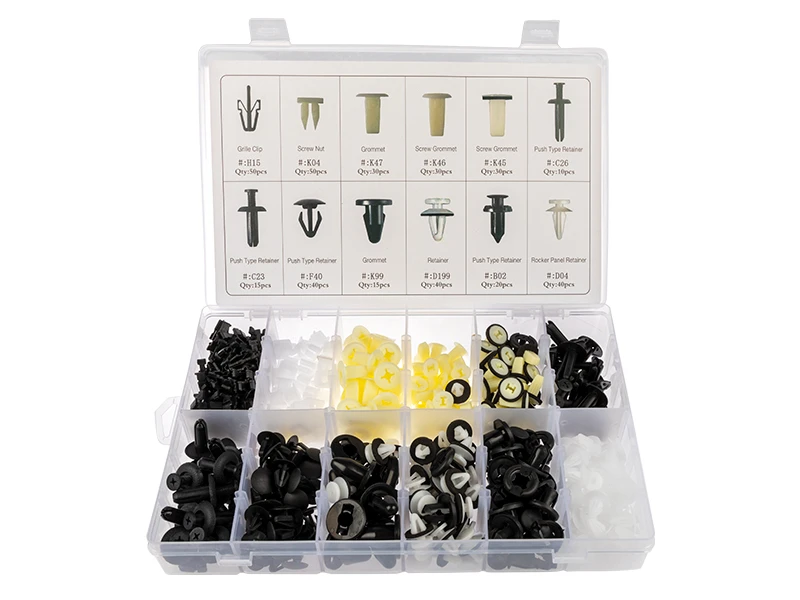 12 erilaista, yhteensä 370kpl sisältävä valikoima sisäverhoilun, suojamuovien, puskureiden ja muiden osien kiinnittämiseen tarkoitettuja muovinastoja.