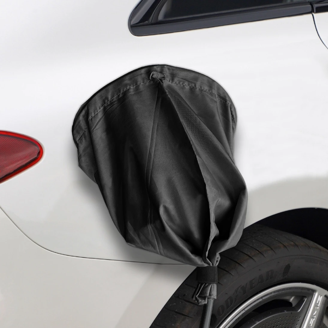 Suoja on helppo kiinnittää auton latausluukun ympärille sisään ommellun magneettinsa avulla. Magneetin ja kiristysnauhan avulla saat suojattua autosi latauspistokkeen aukottomasti.